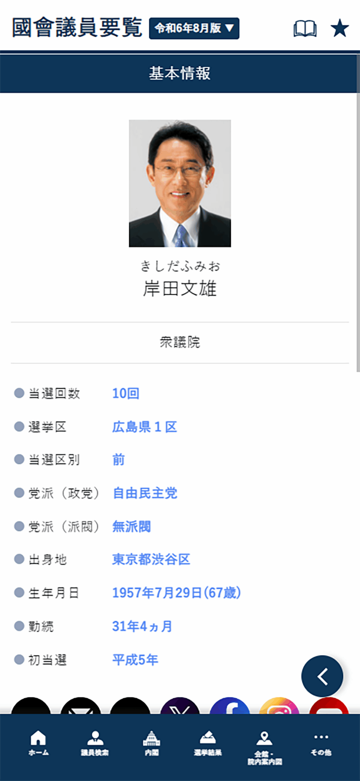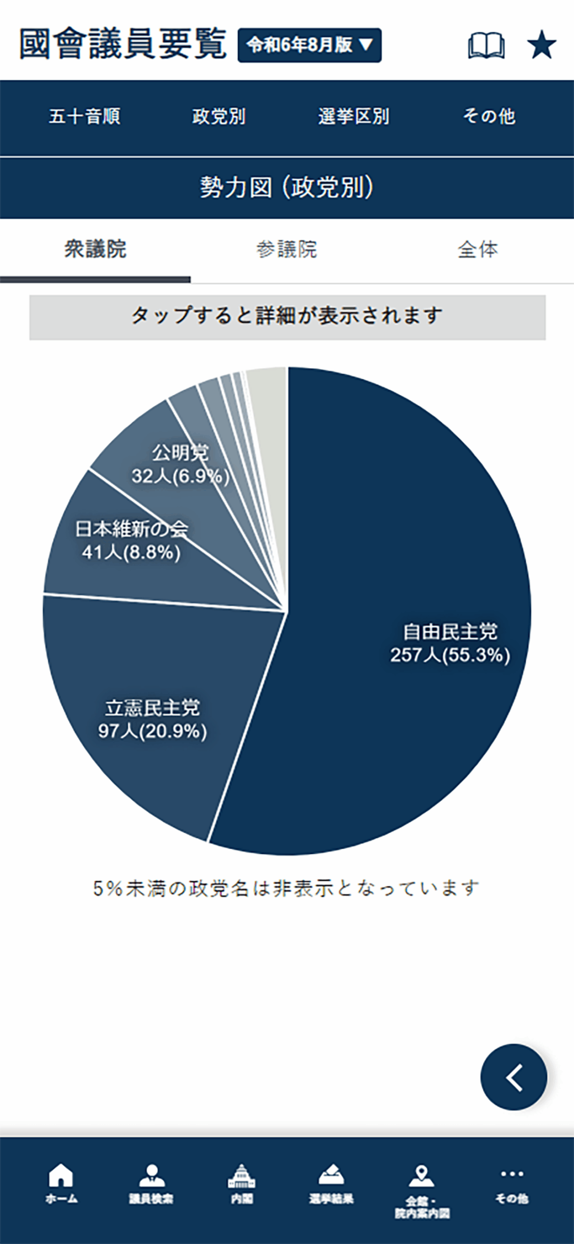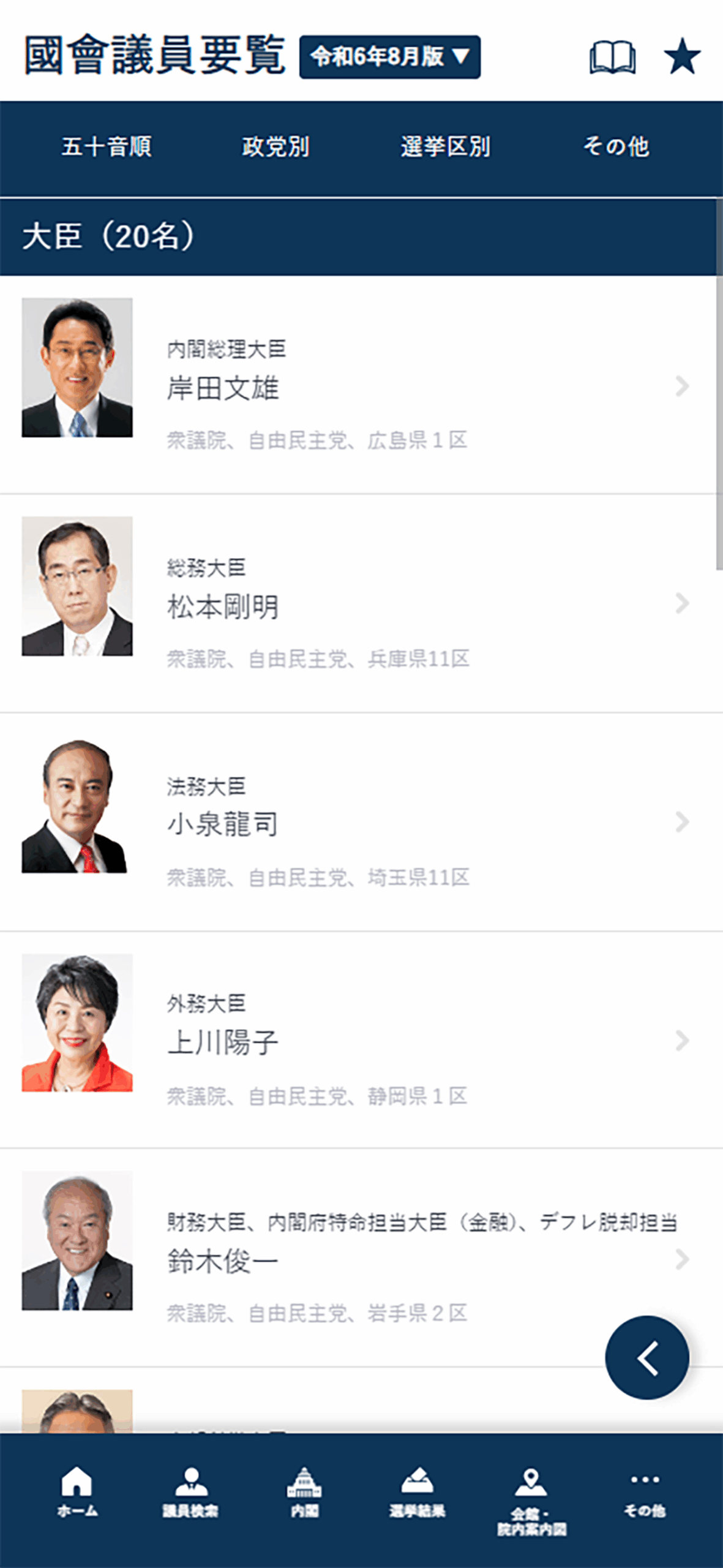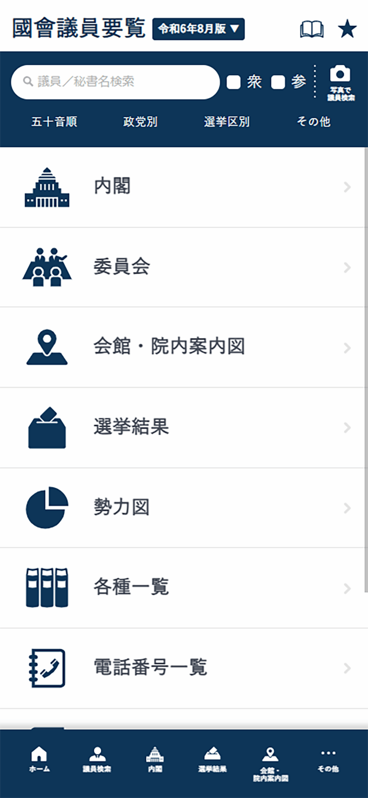 専用アプリの導入により、「国会議員要覧」の豊富な情報にスマートフォンやタブレットで閲覧できるようになりました。